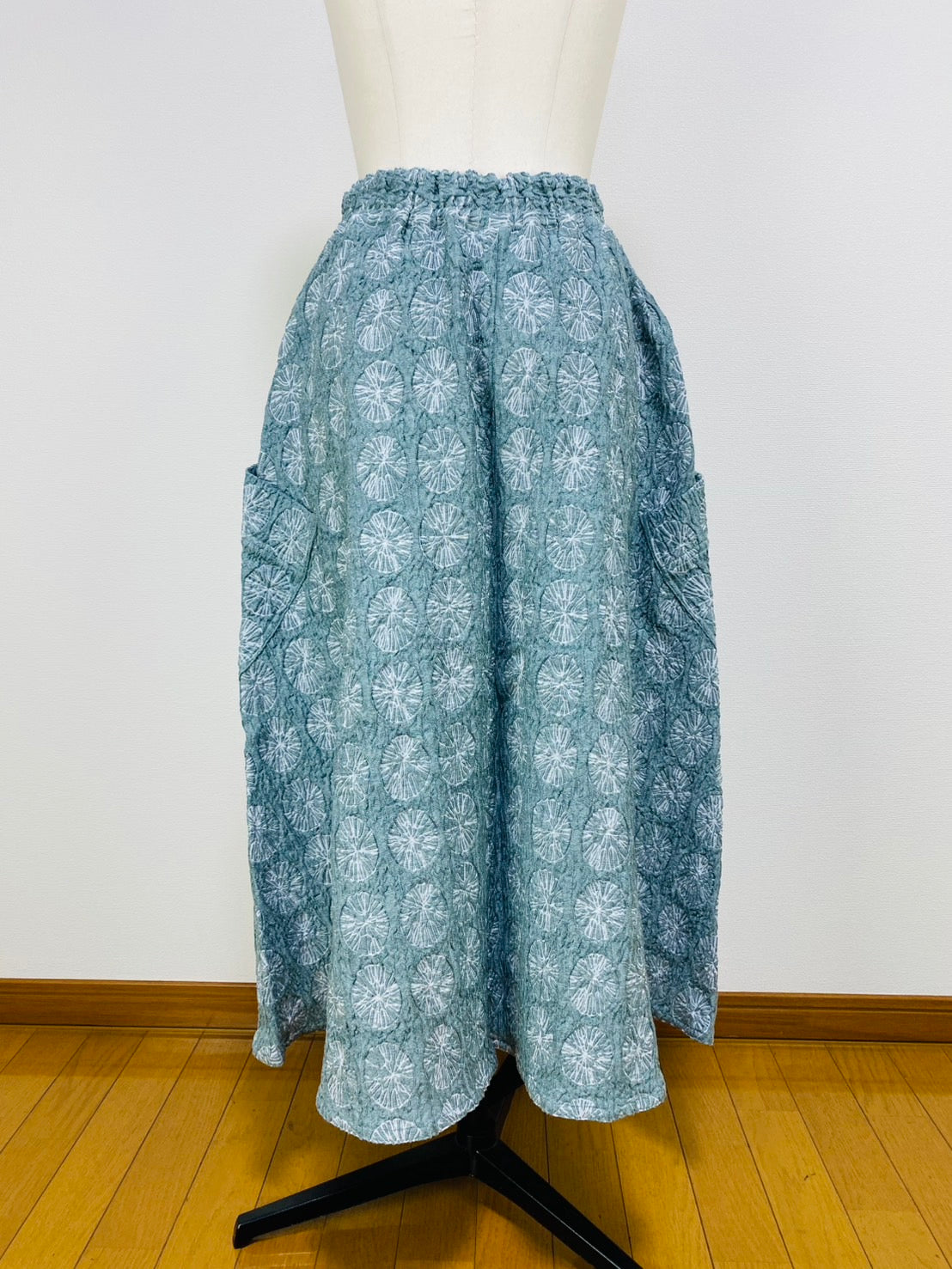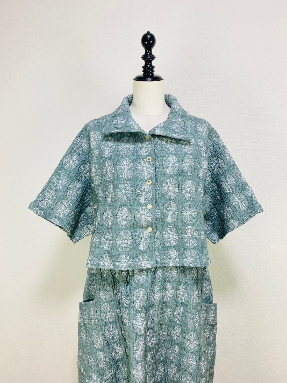 前開きのボレロ風ジャケットと、大きなポケット付きのフレアースカートの、セットアップです。