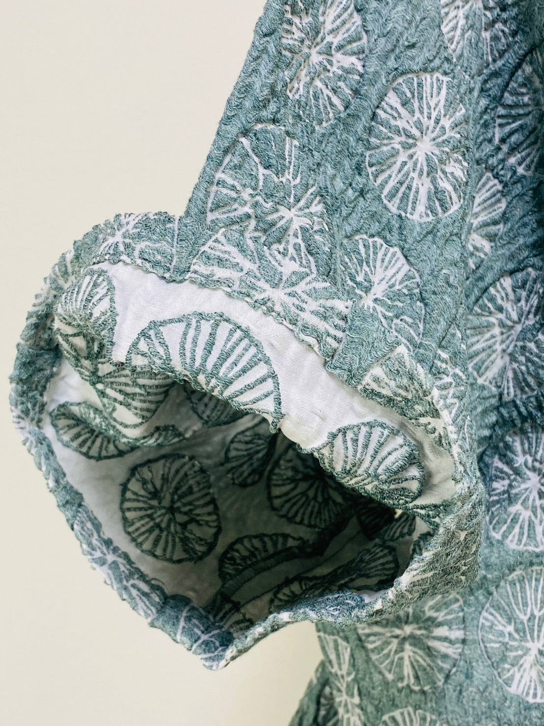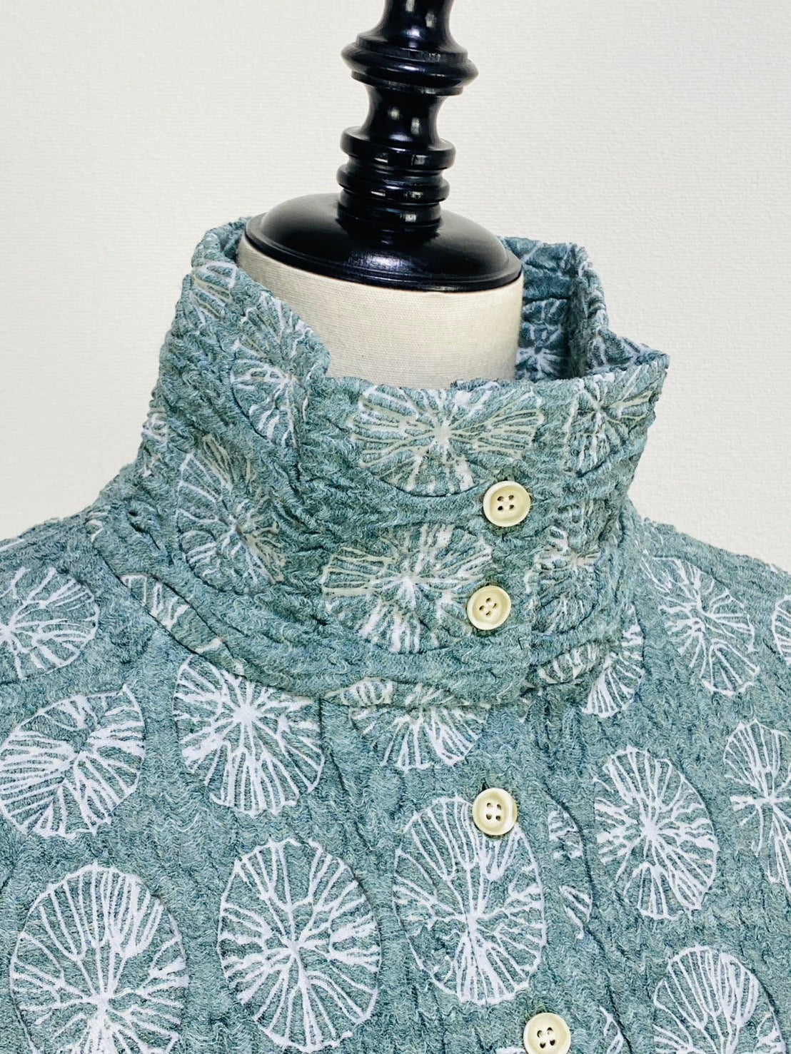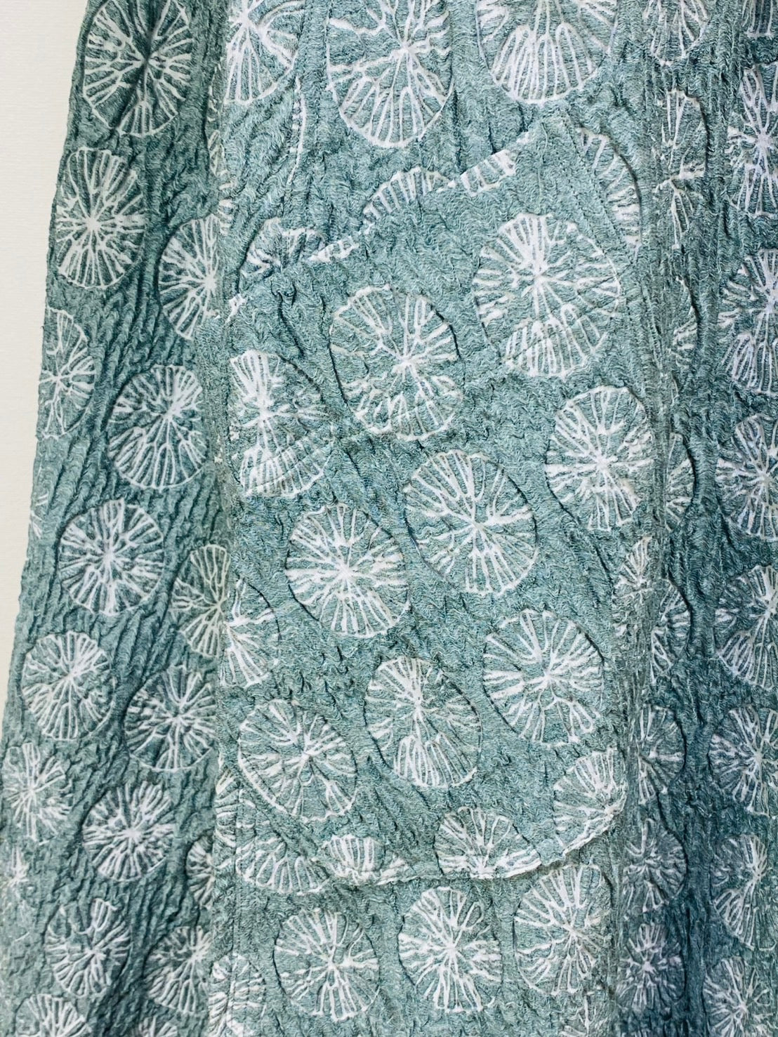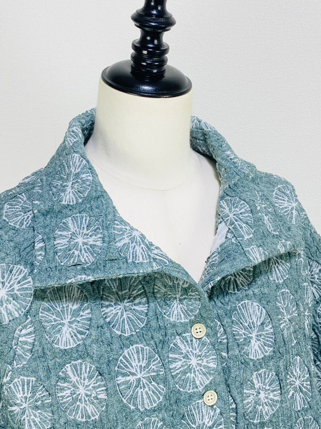 植物や実をデザイン化したドットの模様がおしゃれです。くしゅっとした縮みのある表面も独特な風合いがあります。