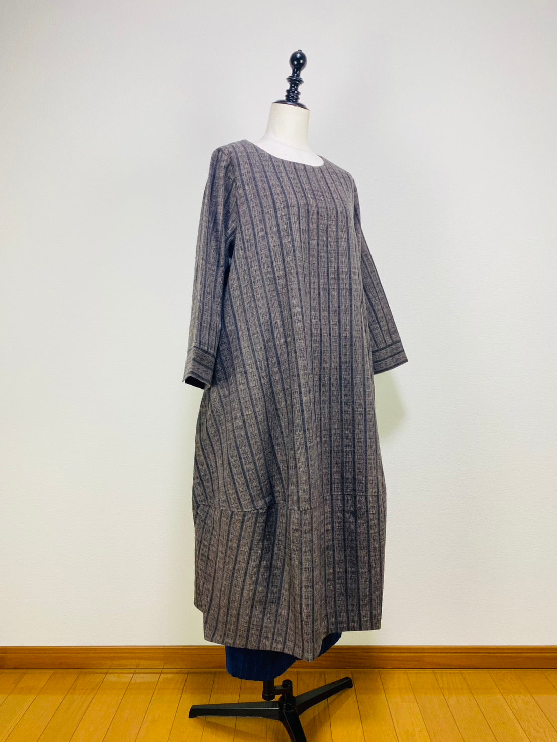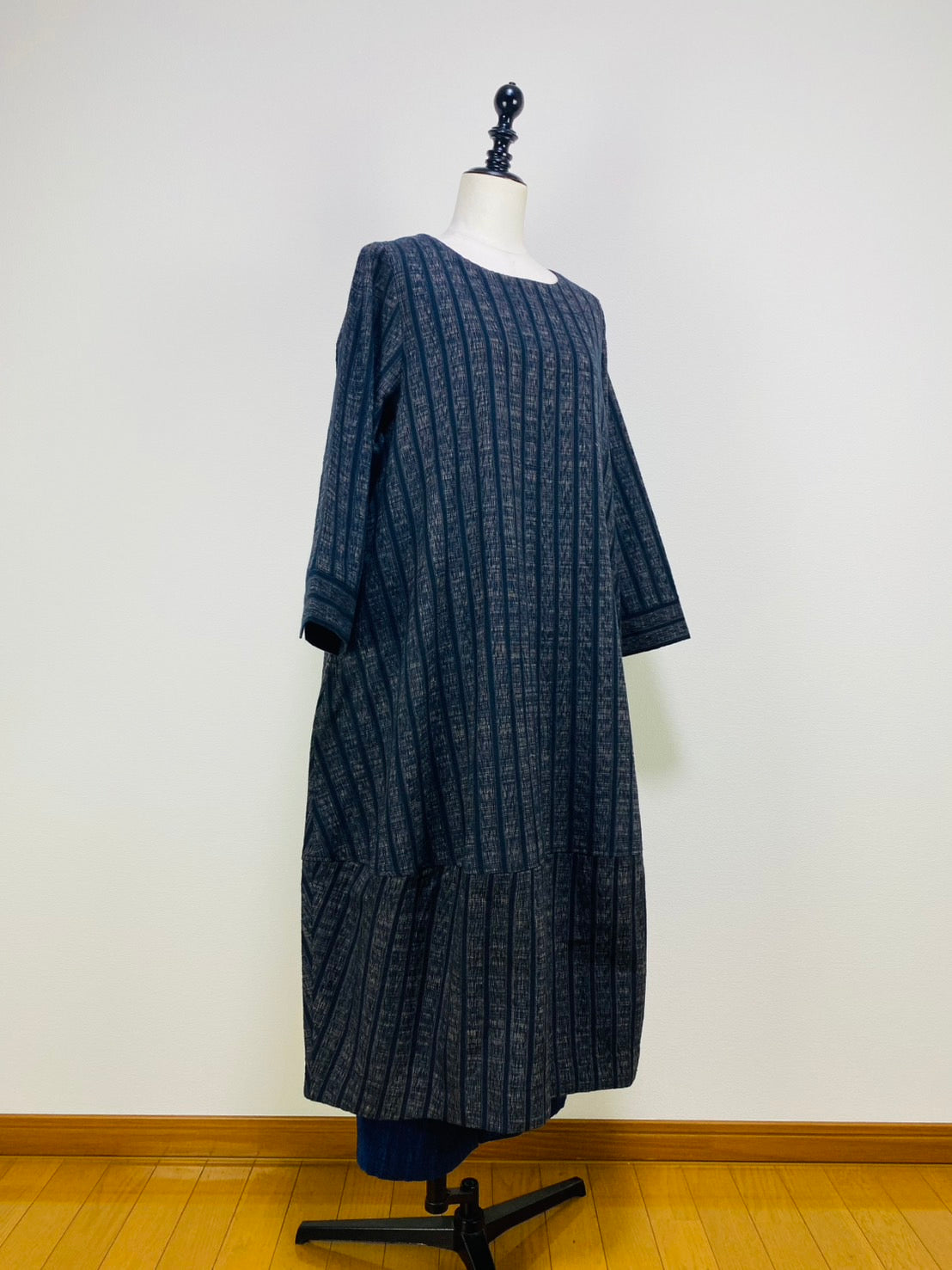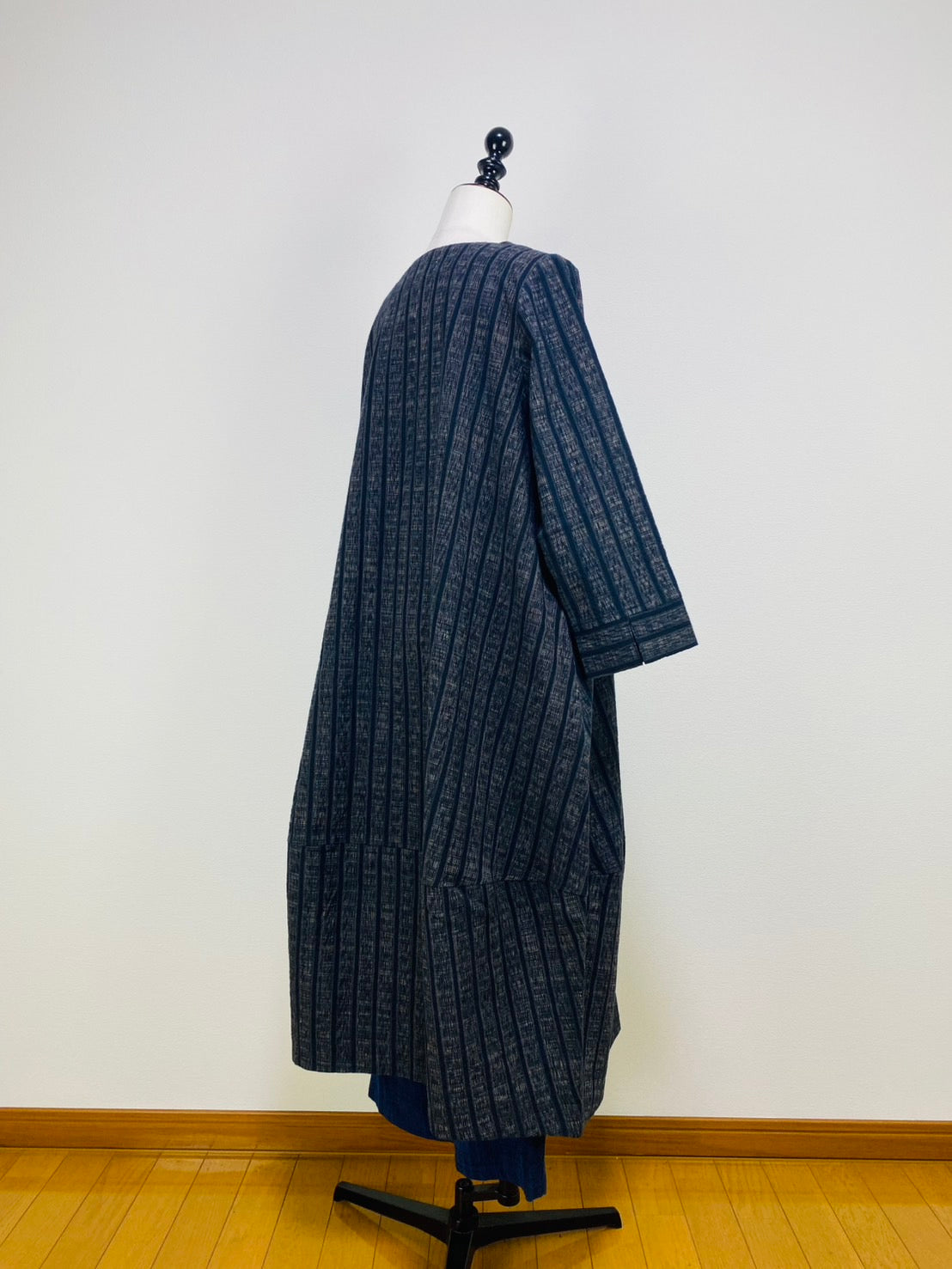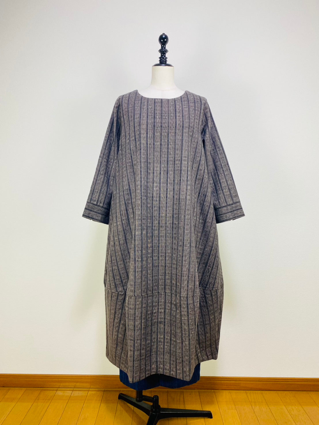 【遠州織物】裾切替えコクーンワンピース 2カラー 逆スラブ絣ストライプ 222101