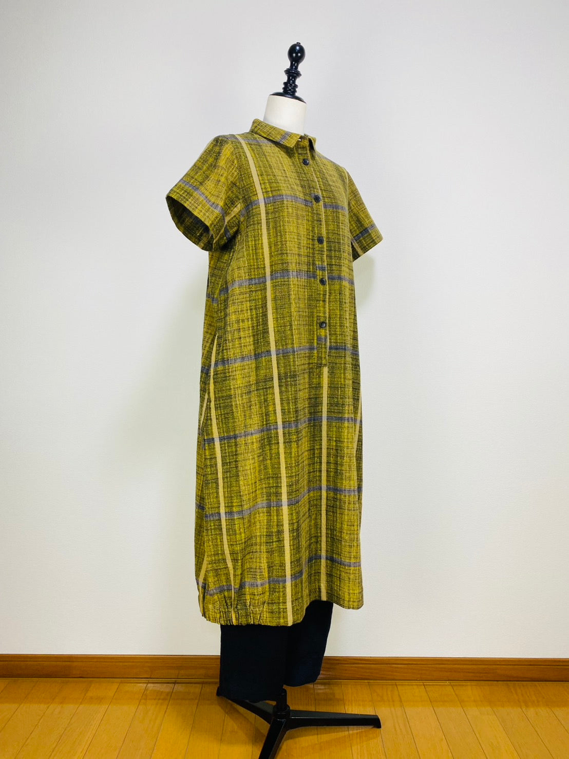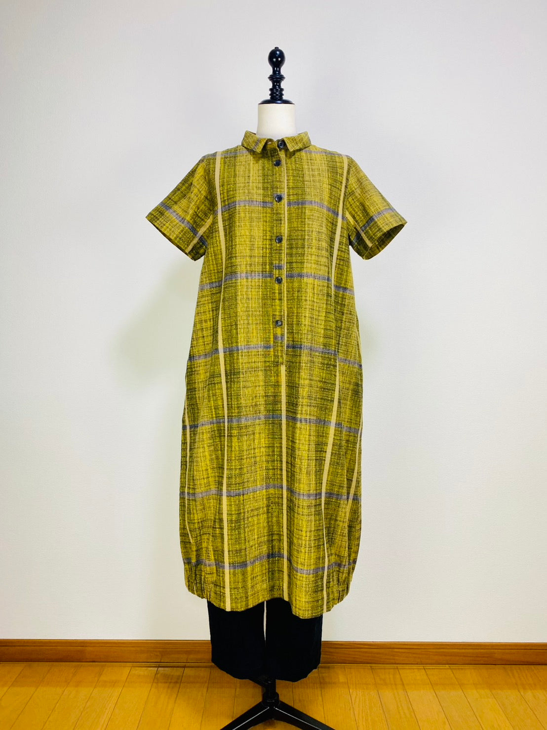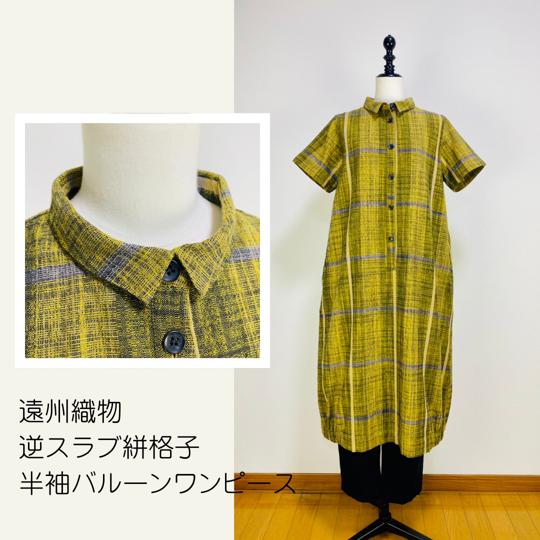 【遠州織物】前立て開きバルーンワンピース 黄色 逆スラブ絣格子 262021