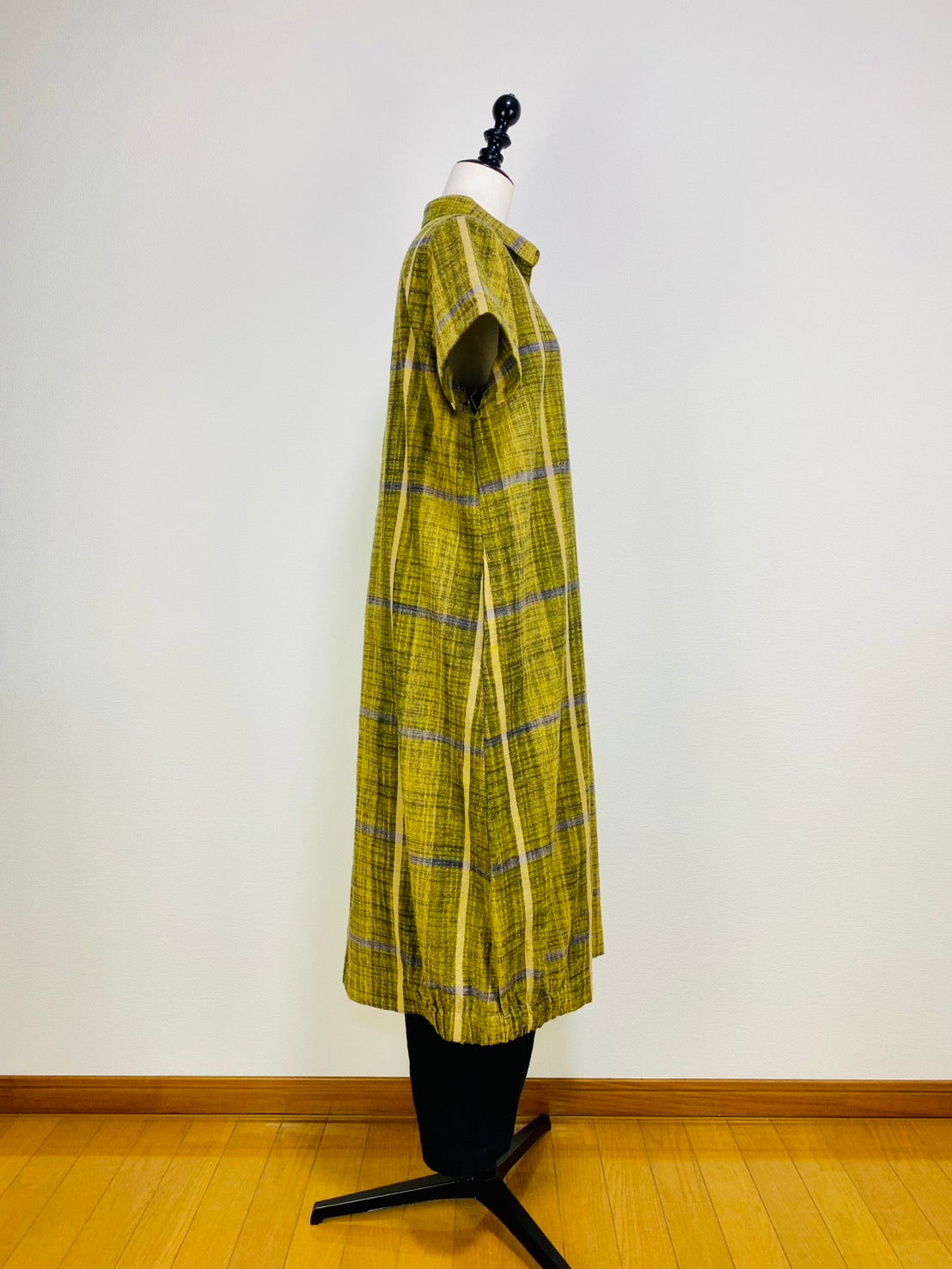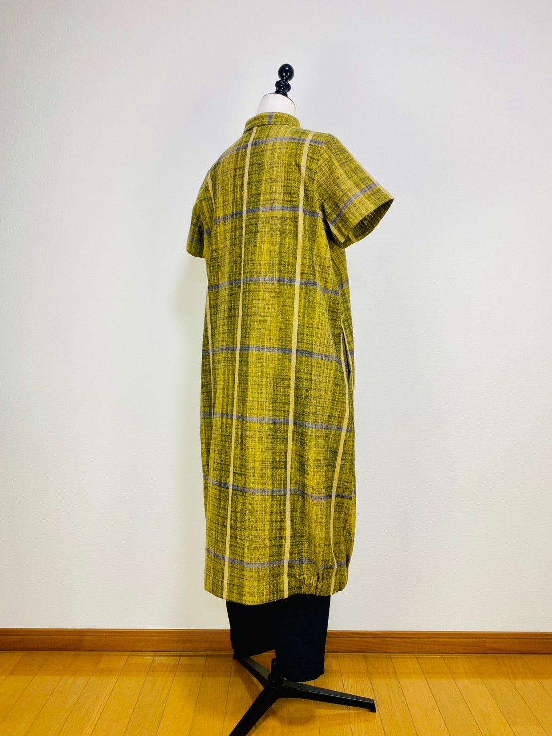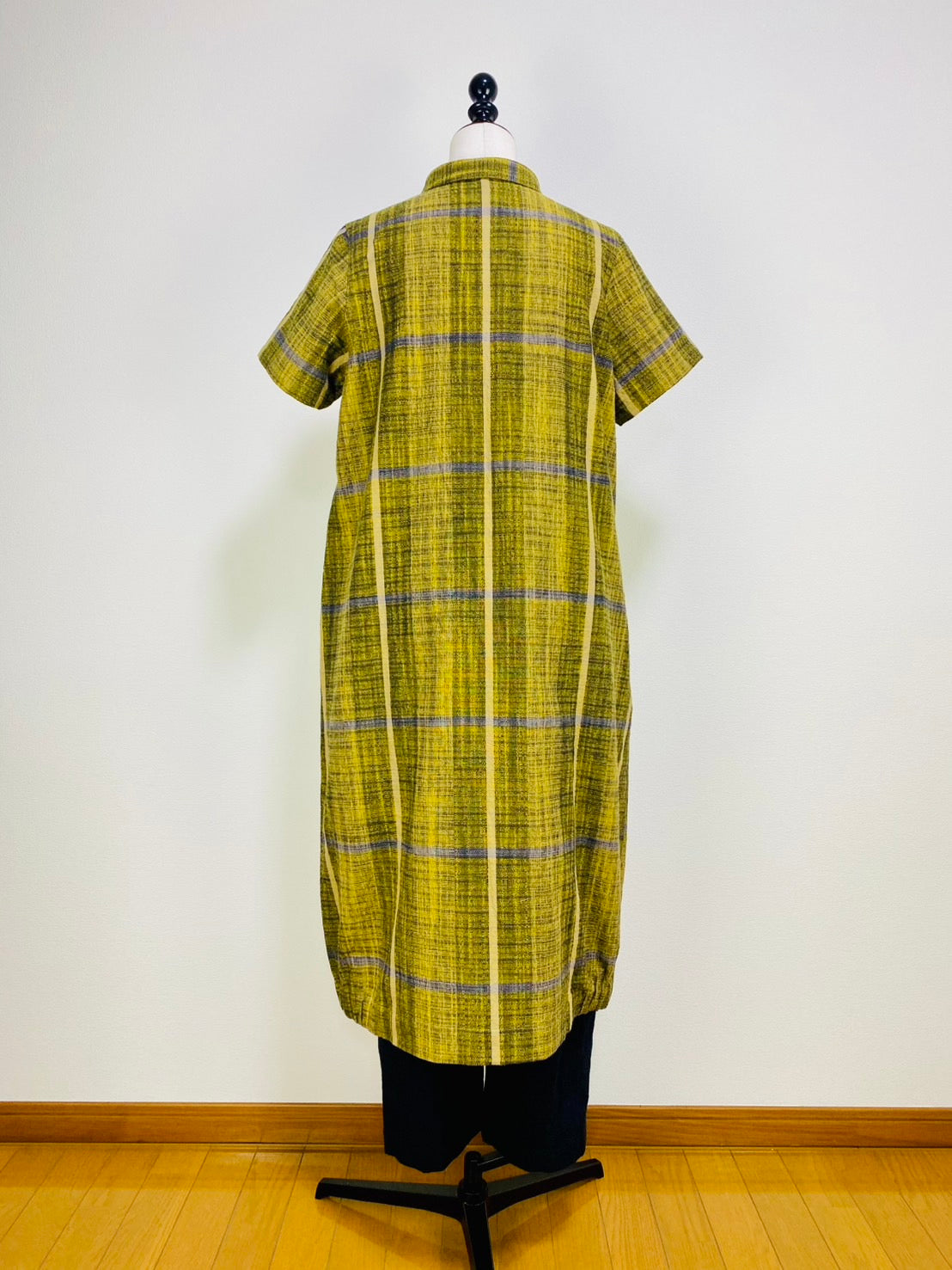 【遠州織物】前立て開きバルーンワンピース 黄色 逆スラブ絣格子 262021
