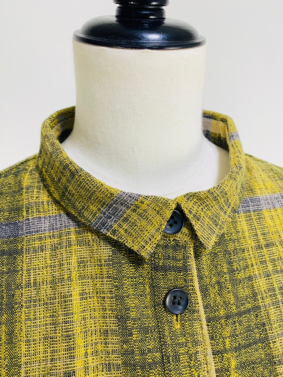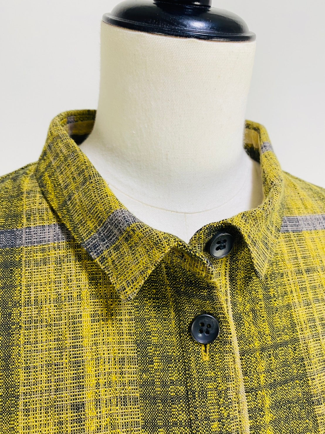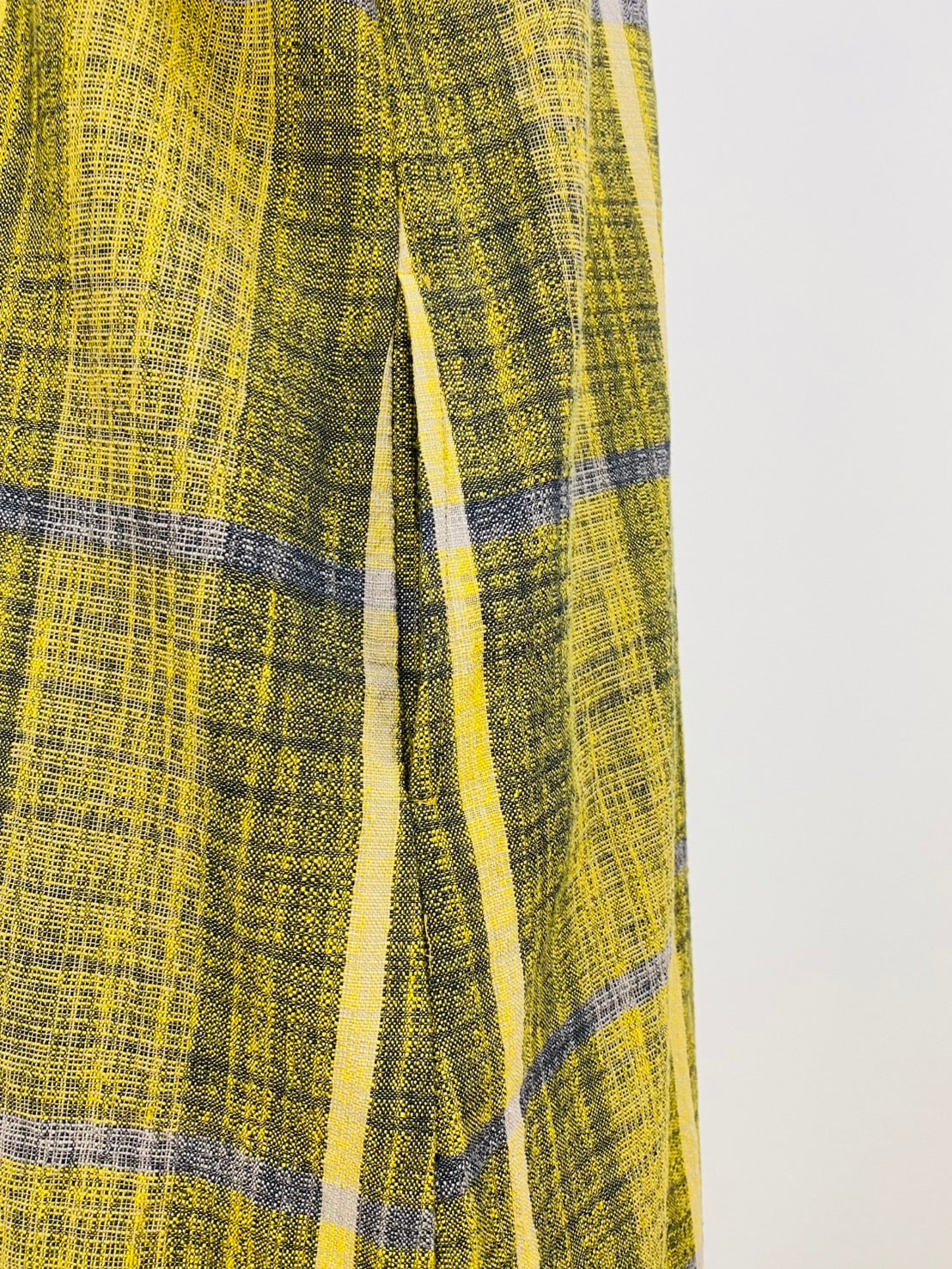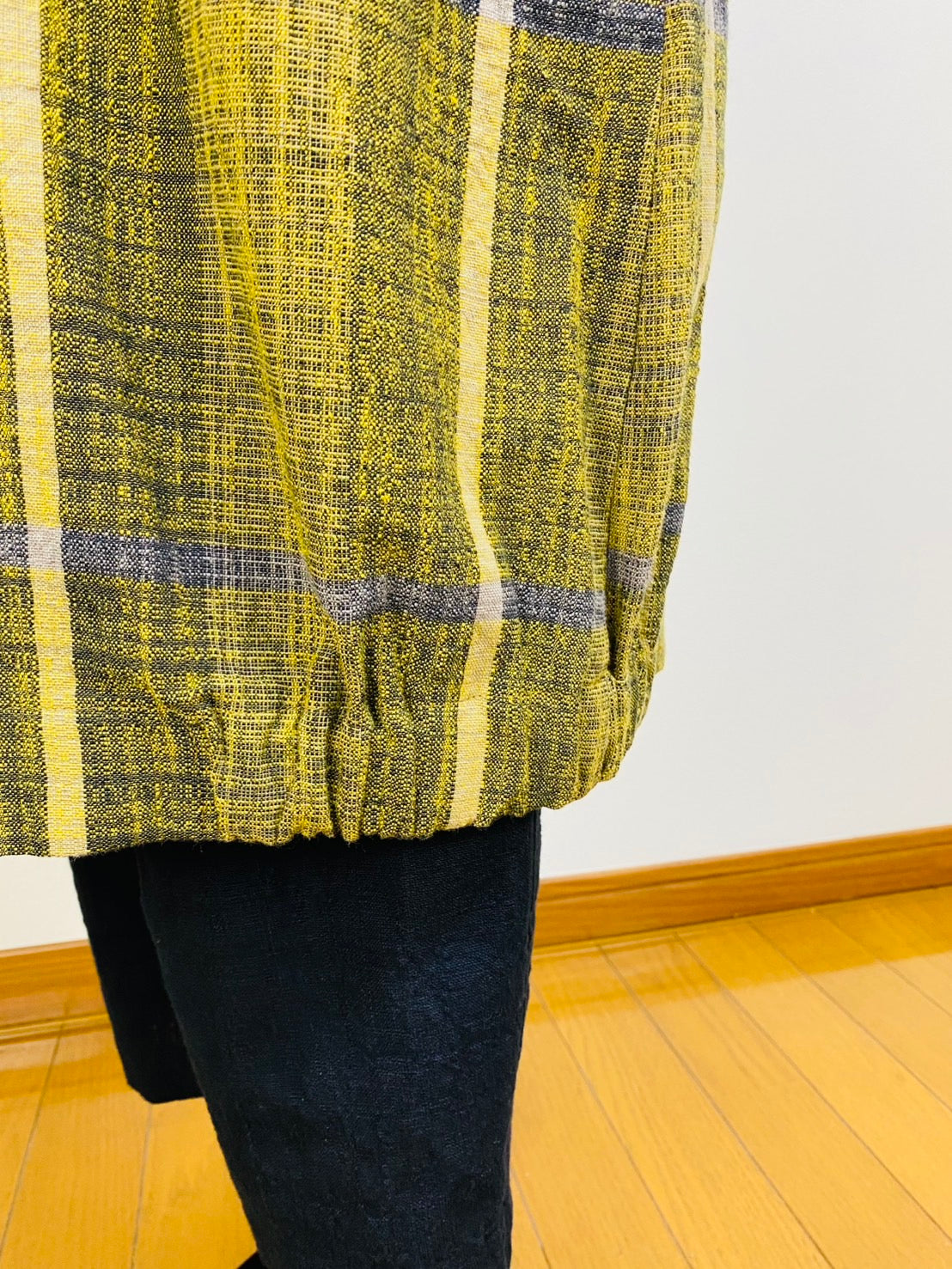 今回の生地は、アイボリー、グレー、黄色のスラブ糸を使ったチェック柄です。凸凹とした風合いのある生地です。