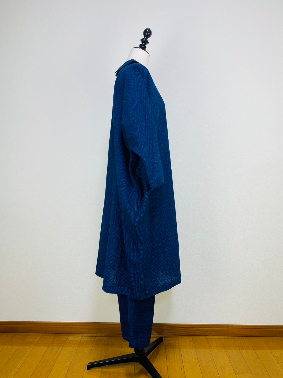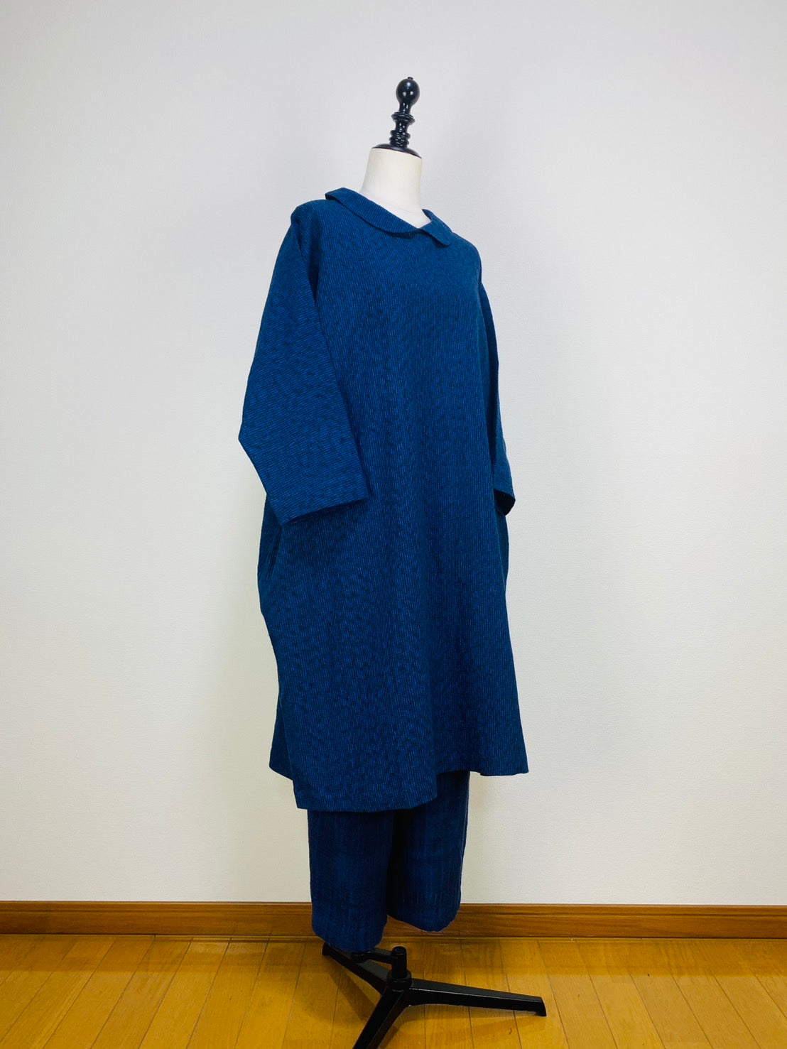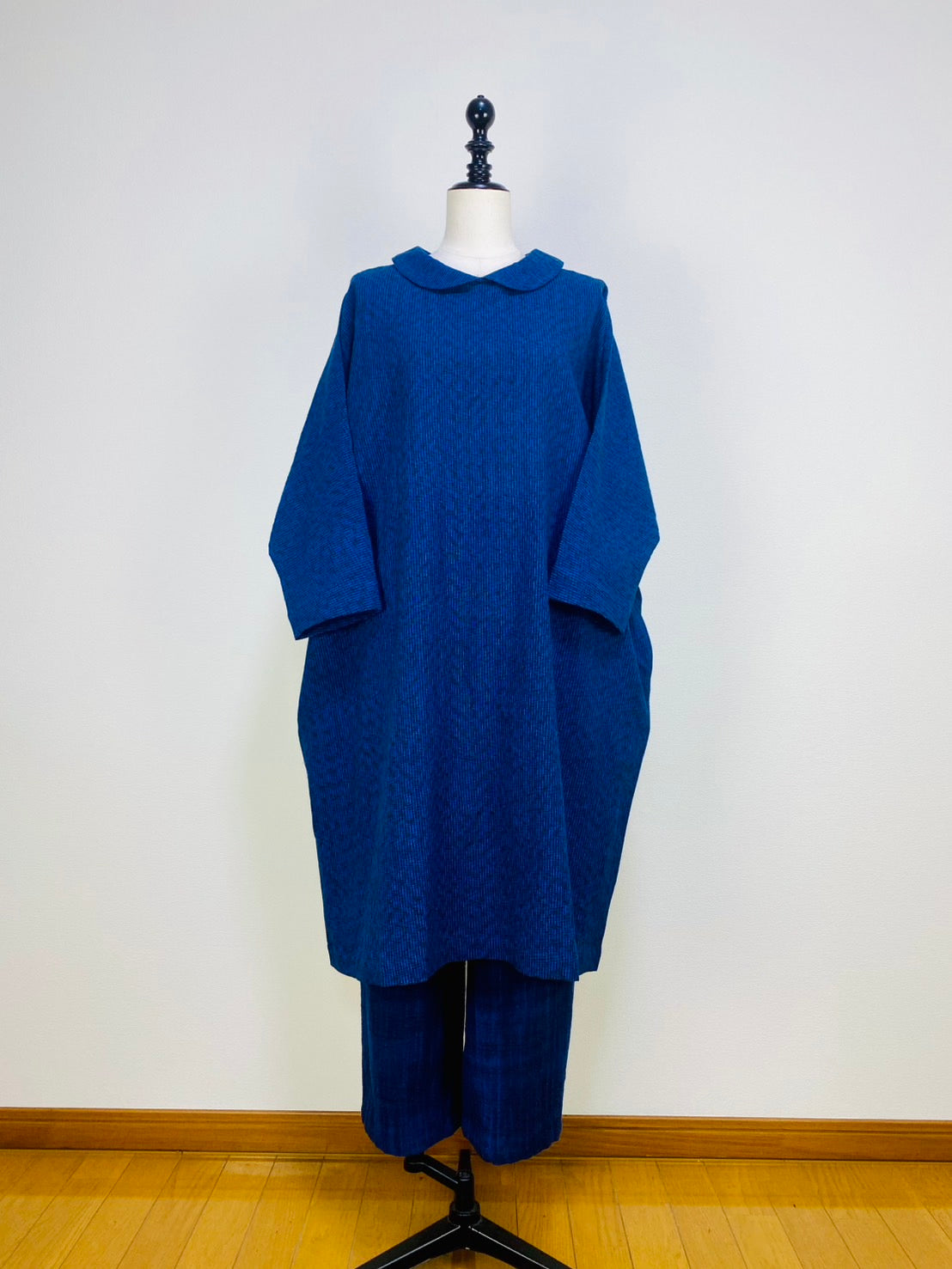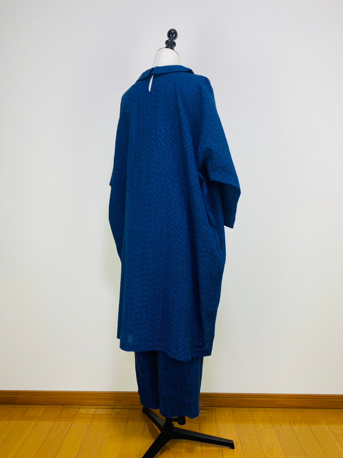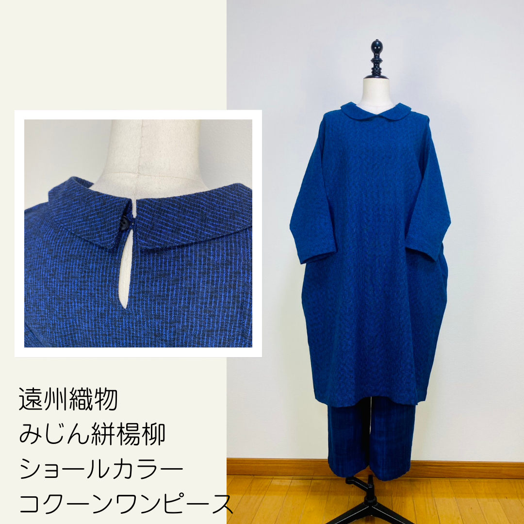 【遠州織物】ショールカラーのコクーンワンピース みじん絣楊柳 紺