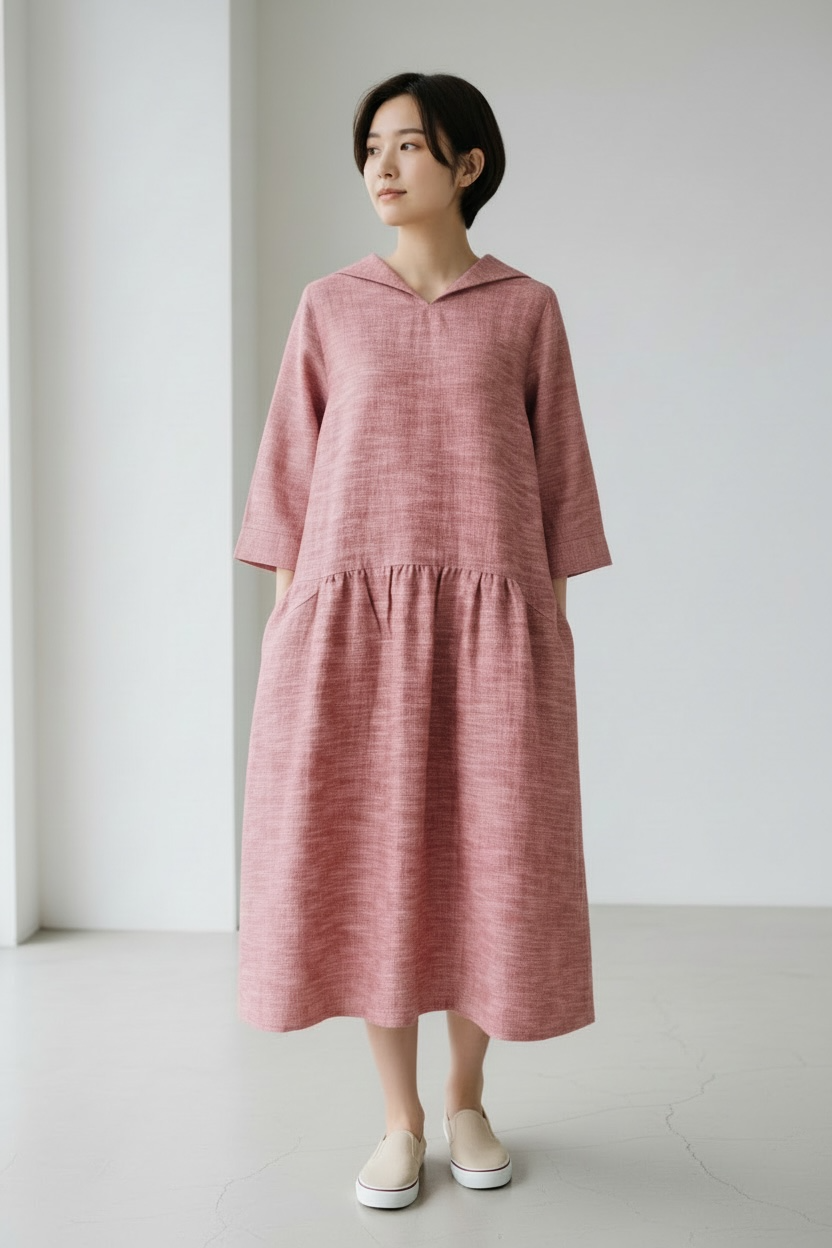 【遠州織物】セーラーカラーの切替ギャザーワンピース 赤ベージュ 逆スラブストライプ 252011