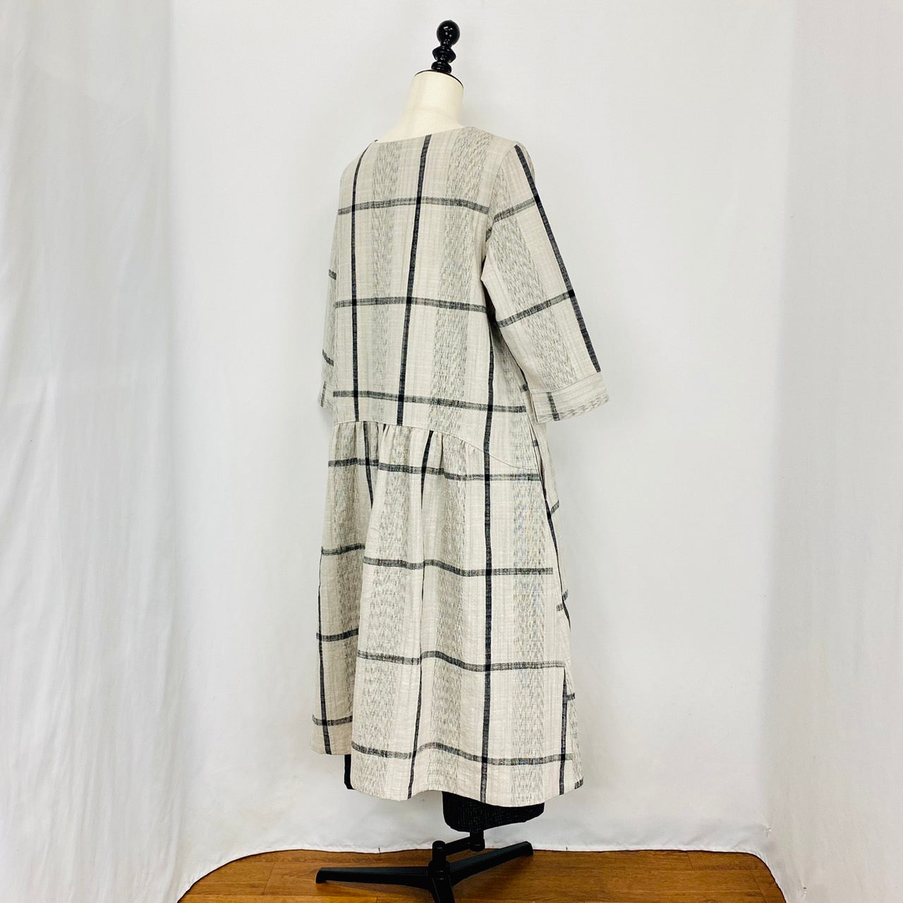 風合いのある大きな格子柄のローウエスト切替えのワンピースです。