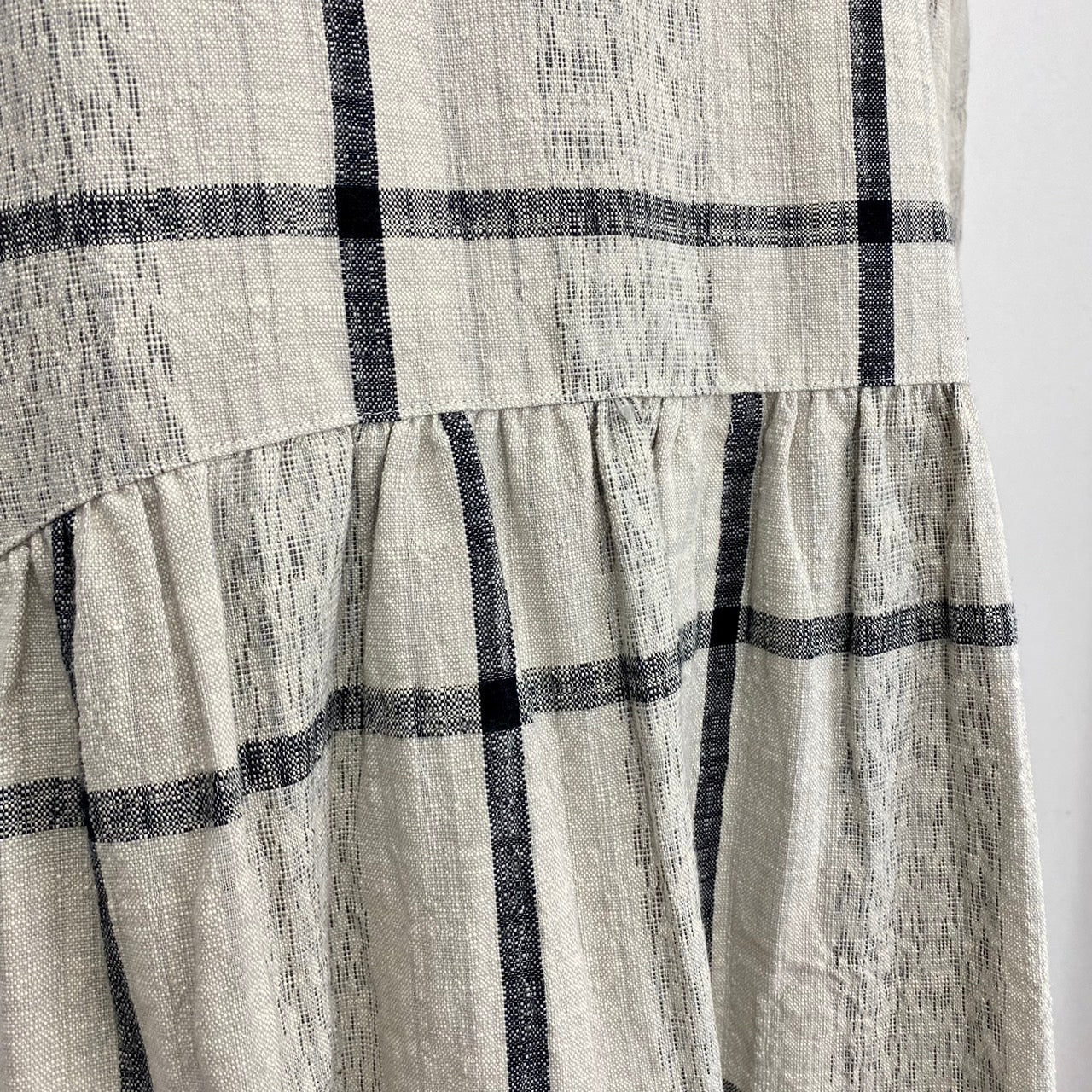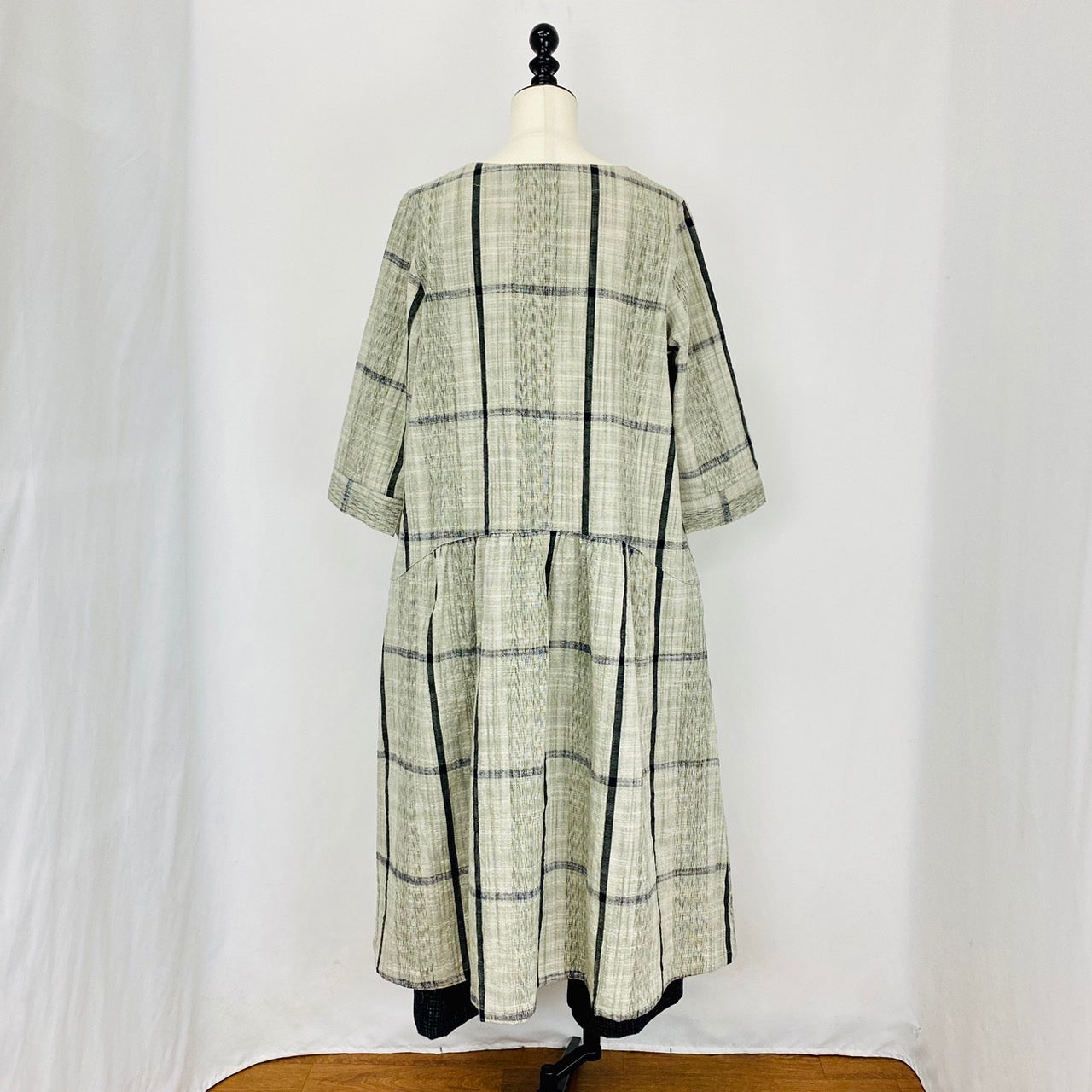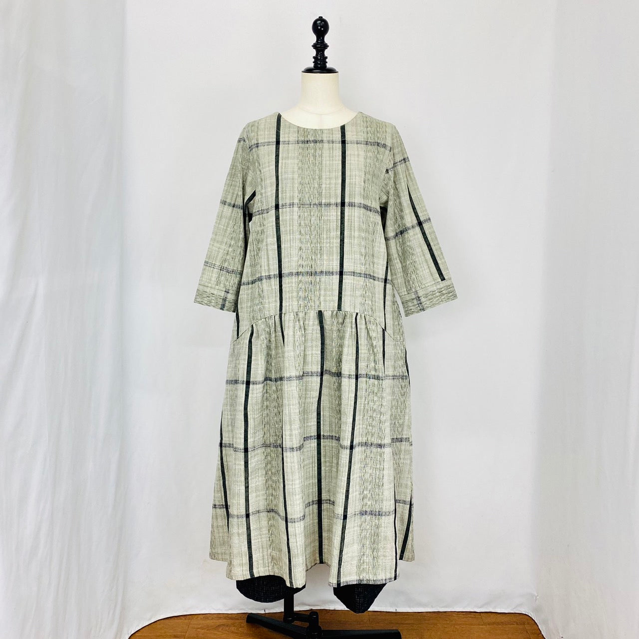 【遠州織物】ローウエスト切替ギャザーワンピース 2カラー 逆スラブ絣格子 232041