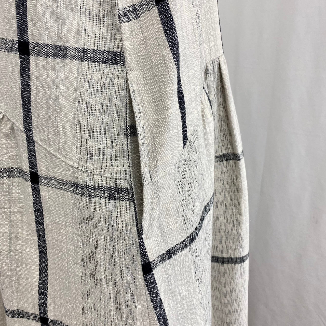 今回の生地は、縦に黒と絣糸が入っています。横にも黒が入って大きな格子柄になっています。