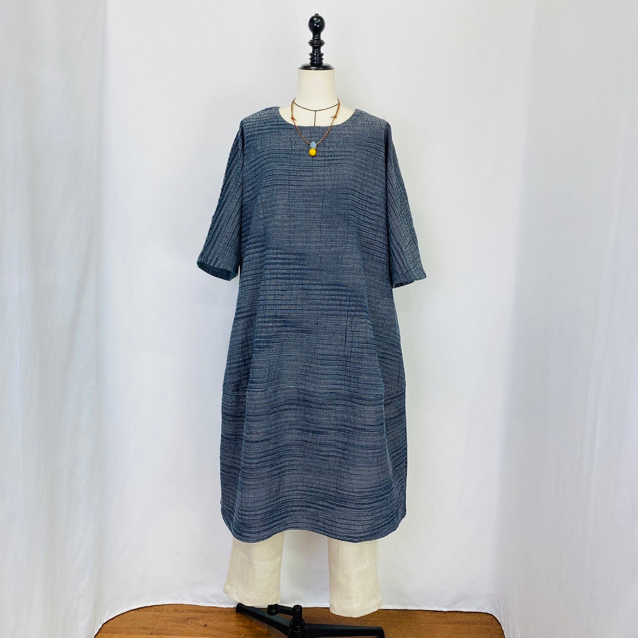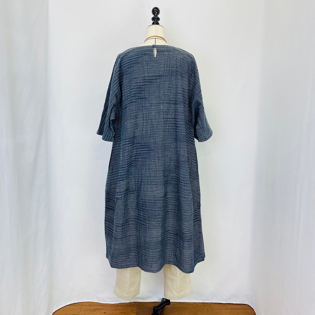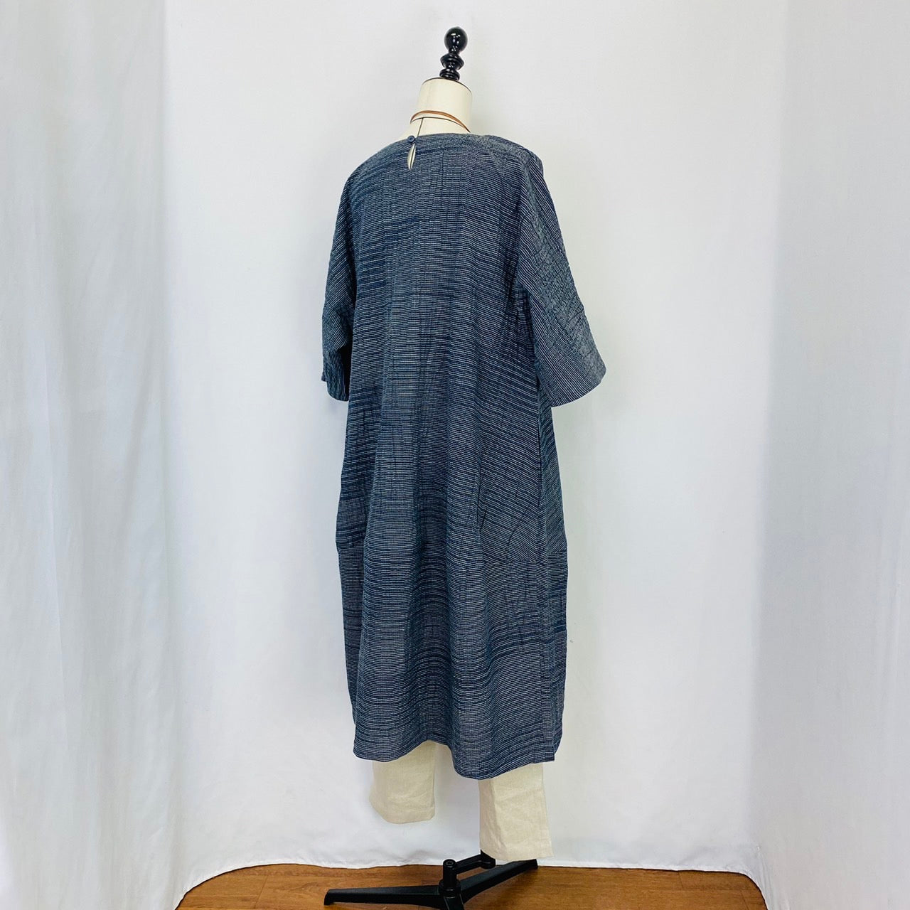 遠州織物のうすで逆スラブ絣ストライプを使用したワンピースです。