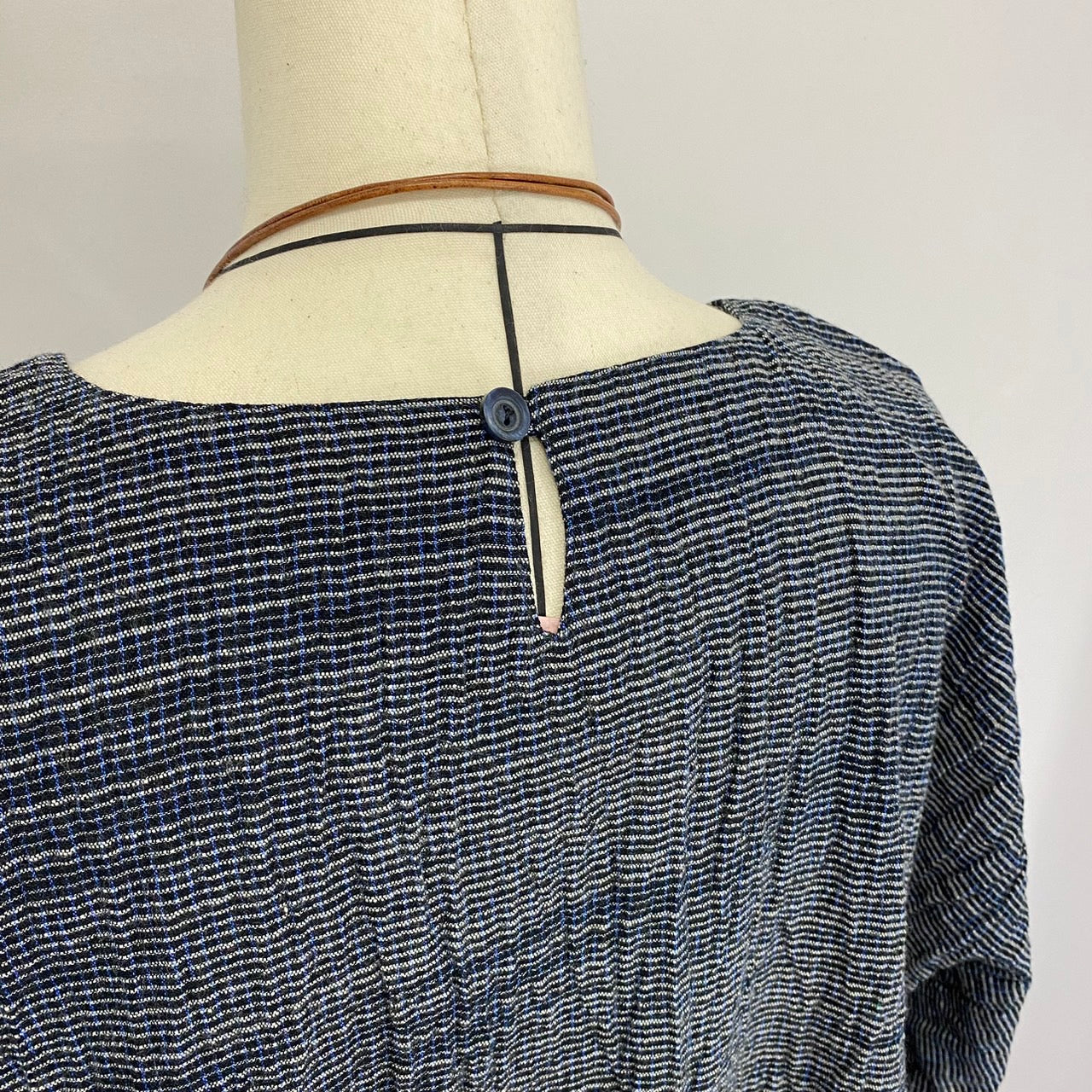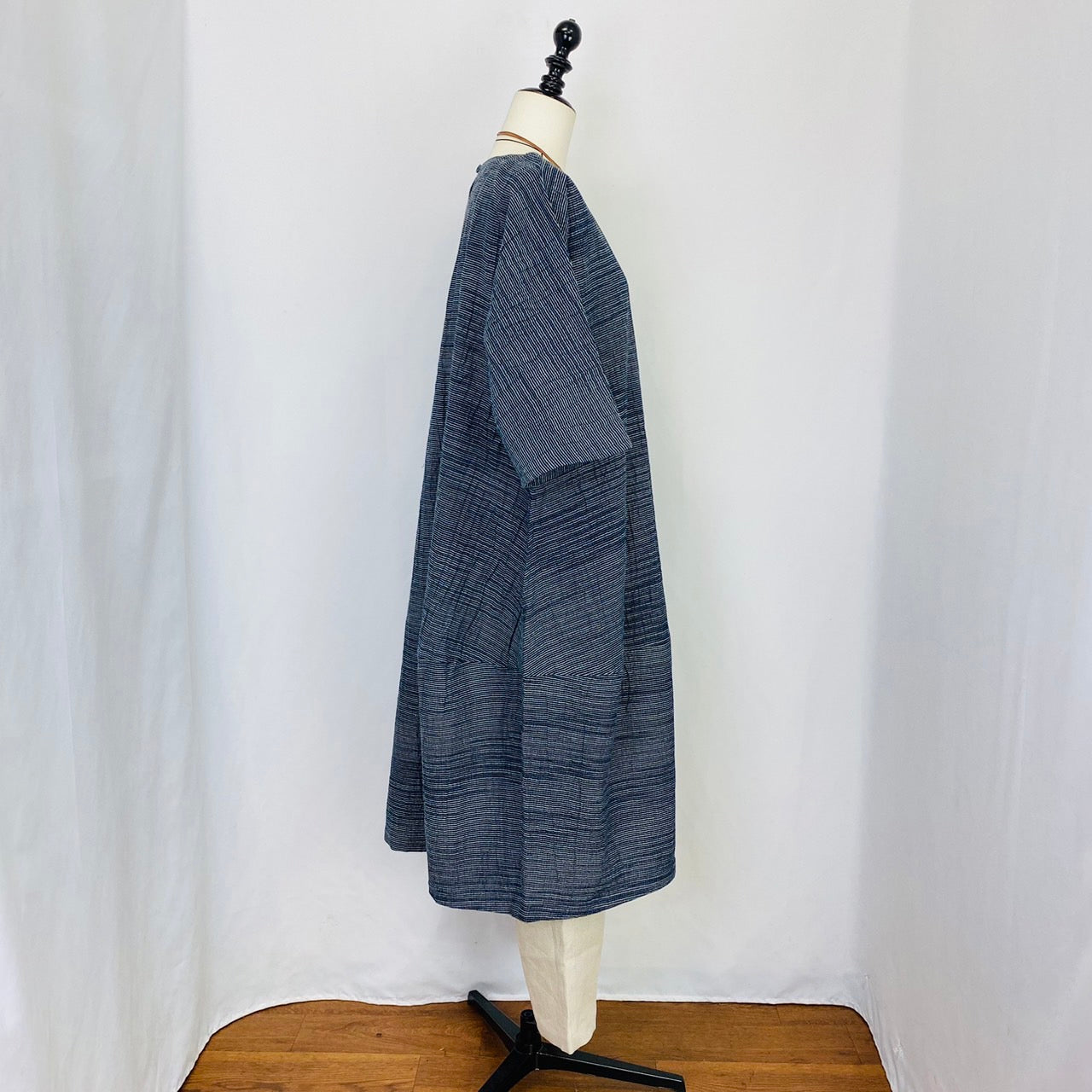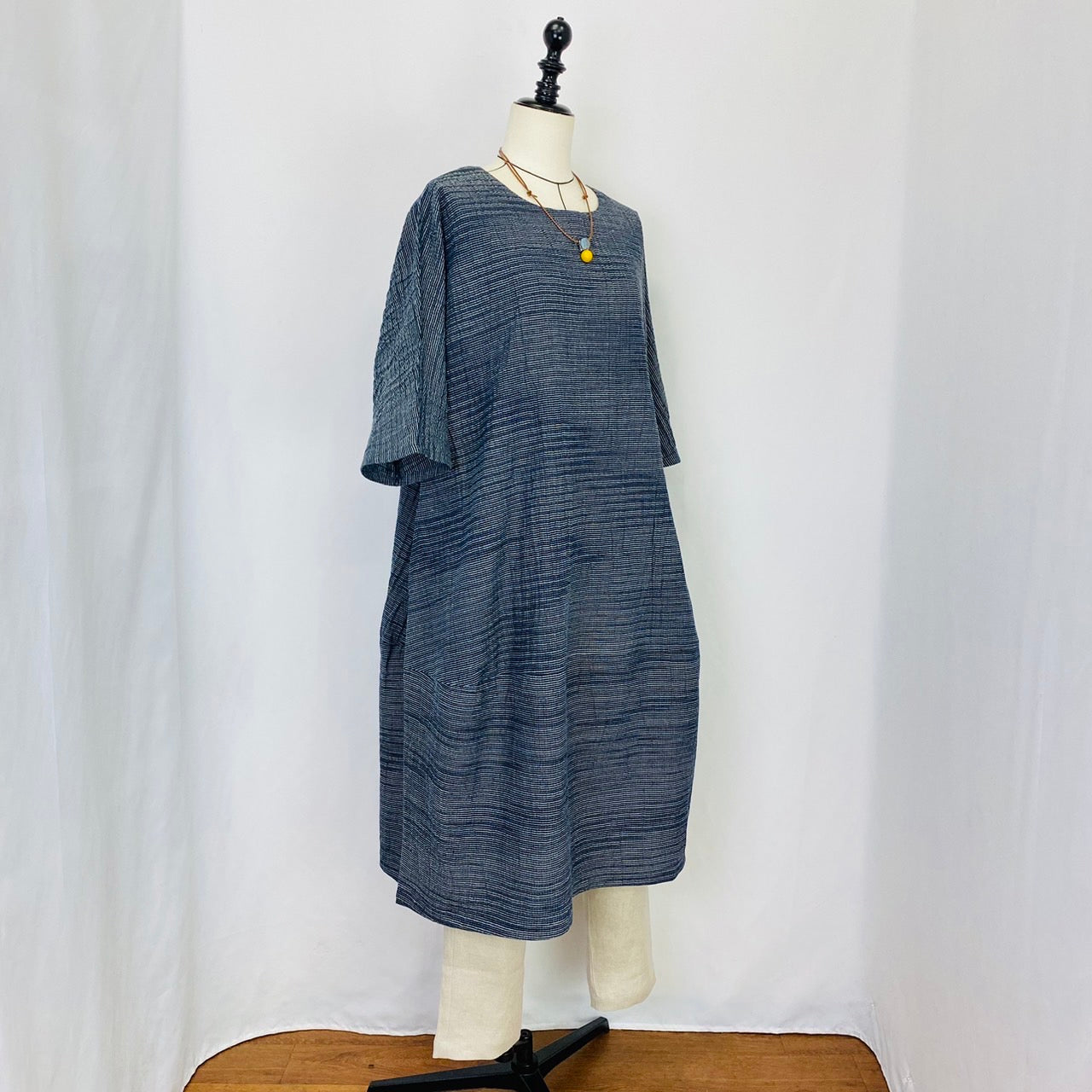 遠州織物のうすで逆スラブ絣ストライプを使用したワンピースです。